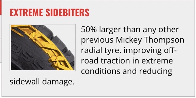 The side-biters, according to Mickey Thompson, are 50 per cent larger than any previous radial tyre from the brand, improving off-road traction in extreme conditions and minimising the chance of sidewall damage. This is something we are keenly aware of when running lower than normal tyre pressures in a range of off-road environments, where stakes and rocks can easily rip a sidewall out.