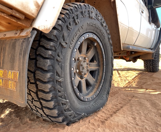 The tyres have a bold look with aggressive side biters and an asymmetric tread pattern, meaning that the tread blocks don’t really correspond to one another in shape and size. Mickey Thompson reckons this design means the blocks provide a greater contact area for improved handling and stability during hard cornering, better traction off road and a more even wear than is typical of a mud-terrain tyre.
