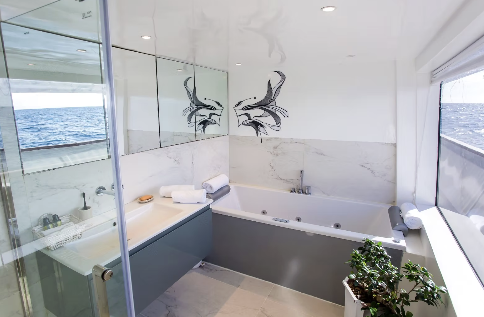 Your private ensuite is designed for indulgence, complete with a Jacuzzi bathtub, glass-enclosed rain shower, and a separate restroom — giving you space and privacy after a day in the water. Add in a generous lounge area, modern finishes, and uninterrupted ocean views, and you’ve got a suite that feels every bit as special as the destination itself.